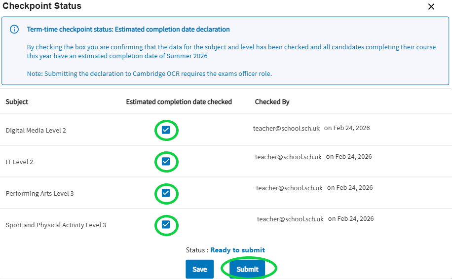 When all subjects have been checked, the 'Submit' button will be active and the status will show as 'Ready to Submit'.